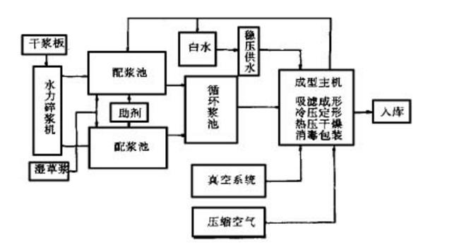生產(chǎn)線是由兩臺(tái)真空模塑成形主機(jī)系統(tǒng)和與主機(jī)規(guī)模相適應(yīng)的輔助系統(tǒng)所組成, 其生產(chǎn)工藝如下:原料甘蔗漿(干漿或濕漿) 制漿,配漿,輸漿,成型主機(jī)(注漿、吸濾成形、熱壓定型、真空熱干),切邊,檢驗(yàn),成品消毒、包裝,入庫。